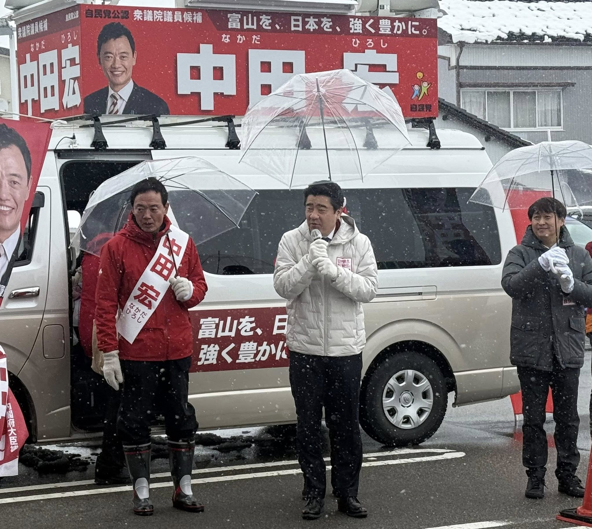 いよいよ選挙戦も最終日2026年02月07日 本日、いよいよ選挙戦も最終日となりました。「日本列島を、強く豊かに」の実現のために、明日の投票日には、富山1区・中田宏候補、富山2区・上田英俊候補、富山3区・橘慶一郎候補を何卒宜しくお願い申し上げます!